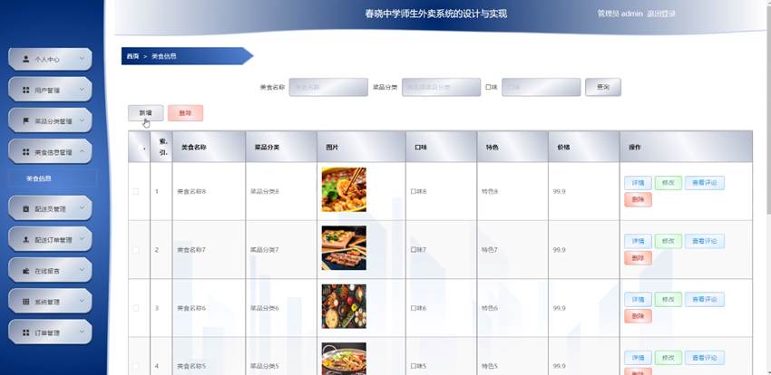 管理员点击美食信息管理。在美食信息页面输入美食名称,菜品分类和口味进行查询、新增或删除美食信息列表,并根据需要对美食详情信息进行详情、修改、查看评论或删除操作;如图5-10所示: