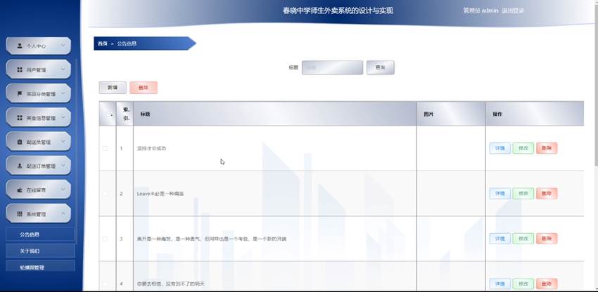 管理员点击系统管理。在公告信息页面输入标题进行查询、新增或删除公告信息列表,并根据需要对公告详情信息进行详情、修改或删除操作;还可以对关于我们和轮播图管理进行详细操作;如图5-12所示: