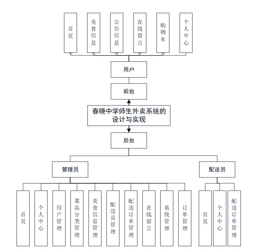 系统整体模块设计:系统分为管理员,配送员和用户三大角色,系统管理员有最大的权限,整体功能展示如图4-3所示。