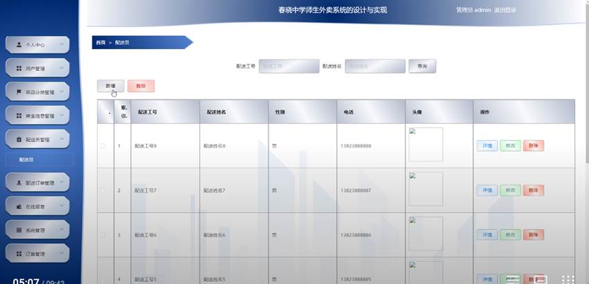 管理员点击配送员管理。在配送员页面输入配送工号和配送姓名进行查询、新增或删除配送员列表,并根据需要对配送员详情信息进行详情、修改或删除操作;如图5-11所示: