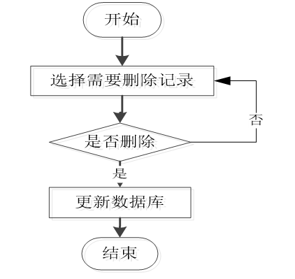 最后为删除信息页面。进入该页面后,用户可以对所要删除的信息进行选择,选择好删除的内容后,会有一个“是否确认删除”的提示框,操作者可以根据自己的意愿来选择“是”或“否”。完成上述操作,系统会会自动地删除的内容进行判断,如果符合删除要求则会成功删除数据记录,并且更新数据库的内容信息;如果删除的数据记录不符合要求,则会有一个“删除失败”的提示框,操作人员需要根据提示来进行修改,修改完成后重新删除知道删除成功。删除信息流程图如图3-6所示: