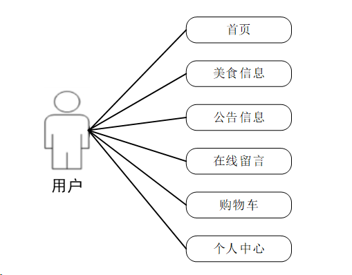 用户登录进入系统可以实现对首页,美食信息,公告信息,在线留言,购物车,个人中心进行查看的同时对美食信息进行购买操作。用户用例分析图,如图3-2所示。