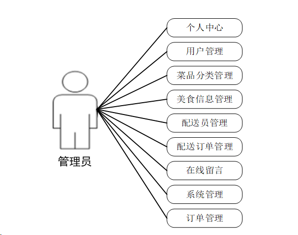 管理员端的功能主要是开放给系统的管理人员使用,能够对用用户地进行理,主要对首页,个人中心,用户管理,菜品分类管理,美食信息管理,配送员管理,配送订单管理,在线留言,系统管理,订单管理进行查询,修改和删除等,对系统整体运行情况进行了解。管理员用例分析图,如图3-1所示。
