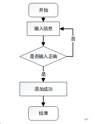 然后是添加信息的页面。进入该页面后,页面会出现一个提示框,示意操作者可以进行信息的添加,从而进行下一步的操作。用户输入想要添加的信息后提交,系统会对输入的内容进行检测。如果检测后输入的信息正确,则会出现“添加成功”的提示框,从而可以进行下一步操作;如果系统检测后检测到想要添加的信息不符合规范要求,则会提示报错,需要进行修改后重新添加。添加信息流程图如图3-5所示: