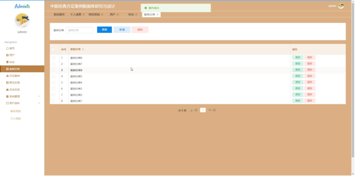 管理员点击案例分类。进入案例分类页面输入案例分类可以搜索、新增或删除案例分类信息,并进行查看修改或删除等操作。如图5-10所示: