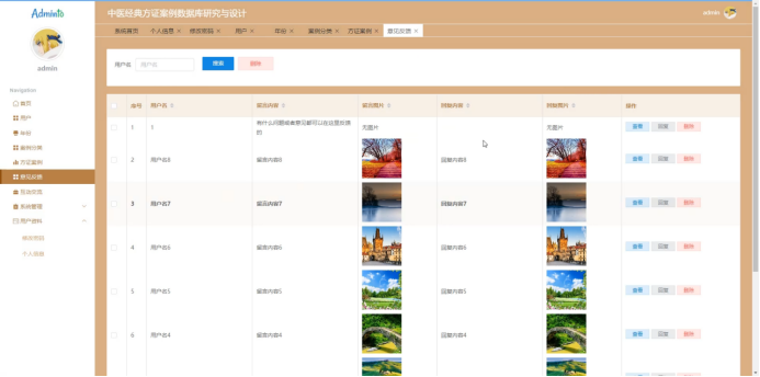 管理员点击意见反馈。进入意见反馈页面输入用户名可以搜索或删除意见反馈信息,并进行查看、回复或删除等操作。如图5-12所示: