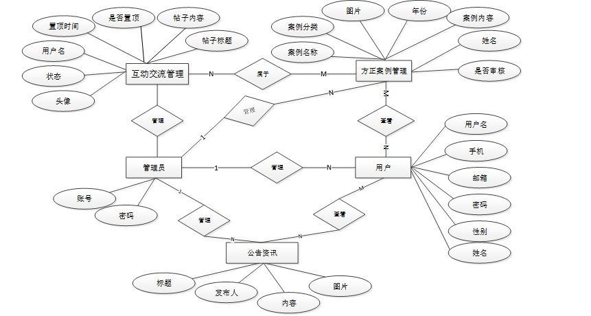 信息世界的基本要素包括实体和关联。现实存在且彼此可区别的事物称为实体。实体可以是实际的人、事或物,还可以是抽象化的概念或联络。在系统中将“用户、管理员、方正案例、公告资讯、互动交流”等作为实体,它们的局部E-R如图4-2所示。