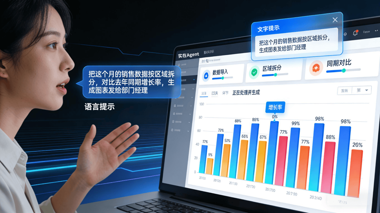 还有个常见误区是把RPA和AI混为一谈。其实早期的RPA只是“规则执行者”,必须把每一步操作都设定好,比如“点击左上角第三个按钮”“在A列第五行输入数据”,完全没有自主判断能力。但现在不一样了,随着生成式AI的融入,RPA已经进化成“智能决策者”,这一点在实在智能的产品实在Agent上体现得特别明显。它能理解自然语言,你不用写代码,只要说“把这个月的销售数据按区域拆分,对比去年同期增长率,生成图表发给部门经理”,它就能自己规划流程、处理数据,甚至在遇到异常时主动提示你,这才是当下最主流的智能自动化模式。