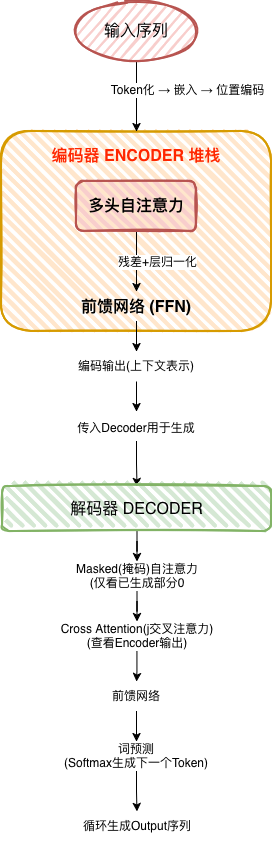 Transformer是现代大模型的基础架构,以自注意力为核心,实现序列并行处理。它由Encoder和Decoder组成,包含嵌入、位置编码、自注意力、多头注意力、前馈网络、残差连接和层归一化等组件。Transformer具有高效并行计算、强长距离建模能力、训练稳定易扩展等优势,广泛应用于自然语言处理、计算机视觉和音频处理等领域。