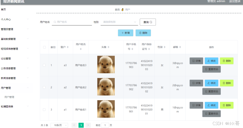 如图5.1显示的就是用户信息管理页面,此页面提供给管理员的功能有:用户信息的查询管理,可以删除用户信息、修改用户信息、新增用户信息,