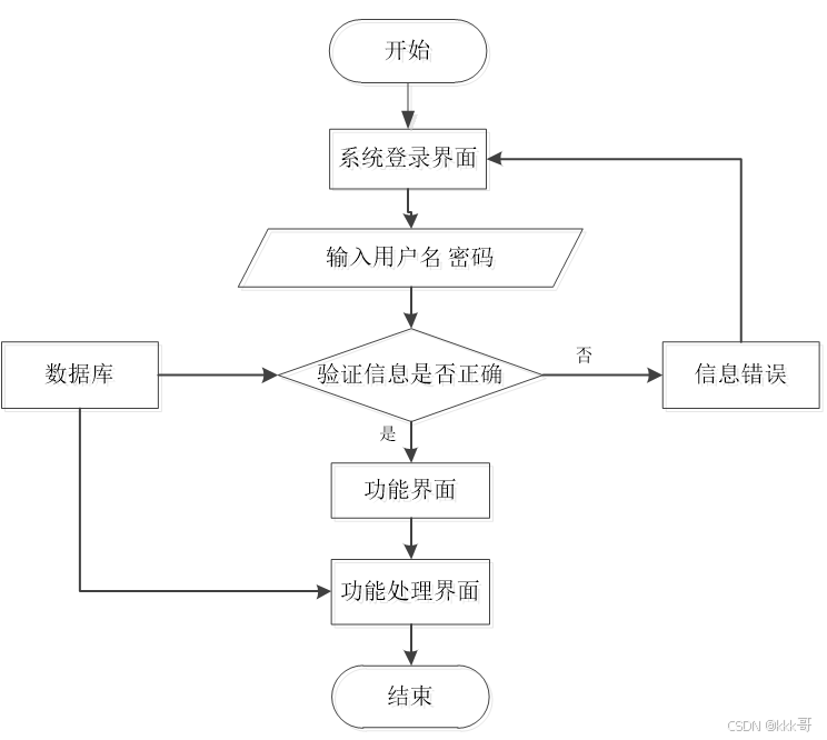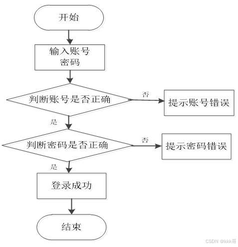 本系统的登录模块,其内部的流程见下图。主要对访问本系统的人员提供的验证信息进行逐个判断,系统面对录入错误的信息会给出提示,比如,提示账号不对,或提示密码不匹配等提示信息。总之,在登录页面填写的所有信息都符合要求,访问者就登录成功了。
