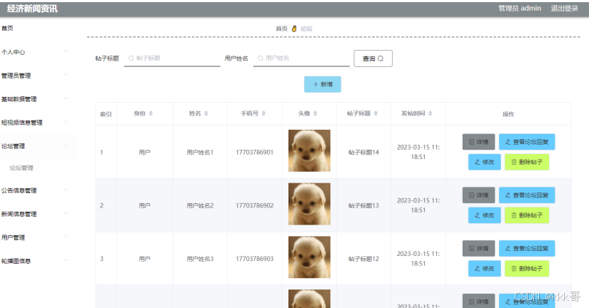 如图5.4显示的就是论坛信息管理页面,此页面提供给管理员的功能有:根据论坛信息进行新增、修改、查询操作等等。