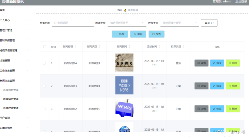 如图5.3显示的就是新闻信息管理页面,此页面提供给管理员的功能有:根据新闻信息进行条件查询,还可以对新闻信息进行新增、修改、查询操作等等。