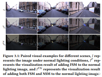 图3.1:不同场景的配对视觉示例,I表示正常光照条件下的图像,I^F表示在正常光照图像上添加FSM后的可视化结果,I^FN表示在正常光照图像上同时添加FSM和NSM后的可视化结果