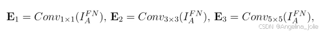 图:低光辅助图像计算公式,其中Concat表示拼接操作,I^FN是低光图像,I_g^FN是光照引导图像。然后,使用三个并行卷积层(核大小分别为1x1、3x3和5x5)提取多尺度特征: