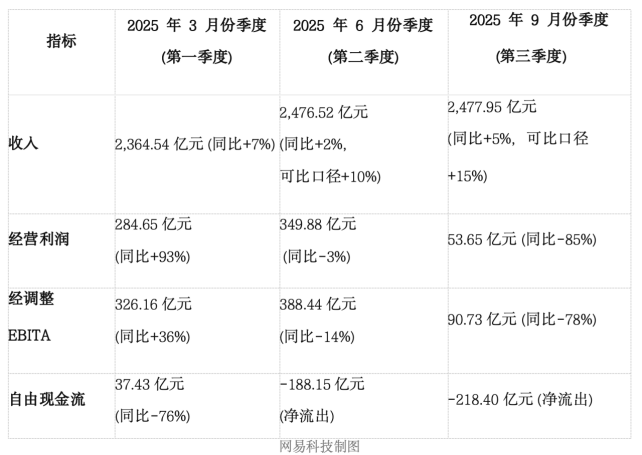 1、利润和现金流承压严重:这是最显著的变化。集团经调整EBITA利润率从2024 Q4近20%的健康水平,断崖式下滑至2025 Q3的3.7%。利润的绝对值在Q3同比暴跌78%。现金流净流出200多亿。