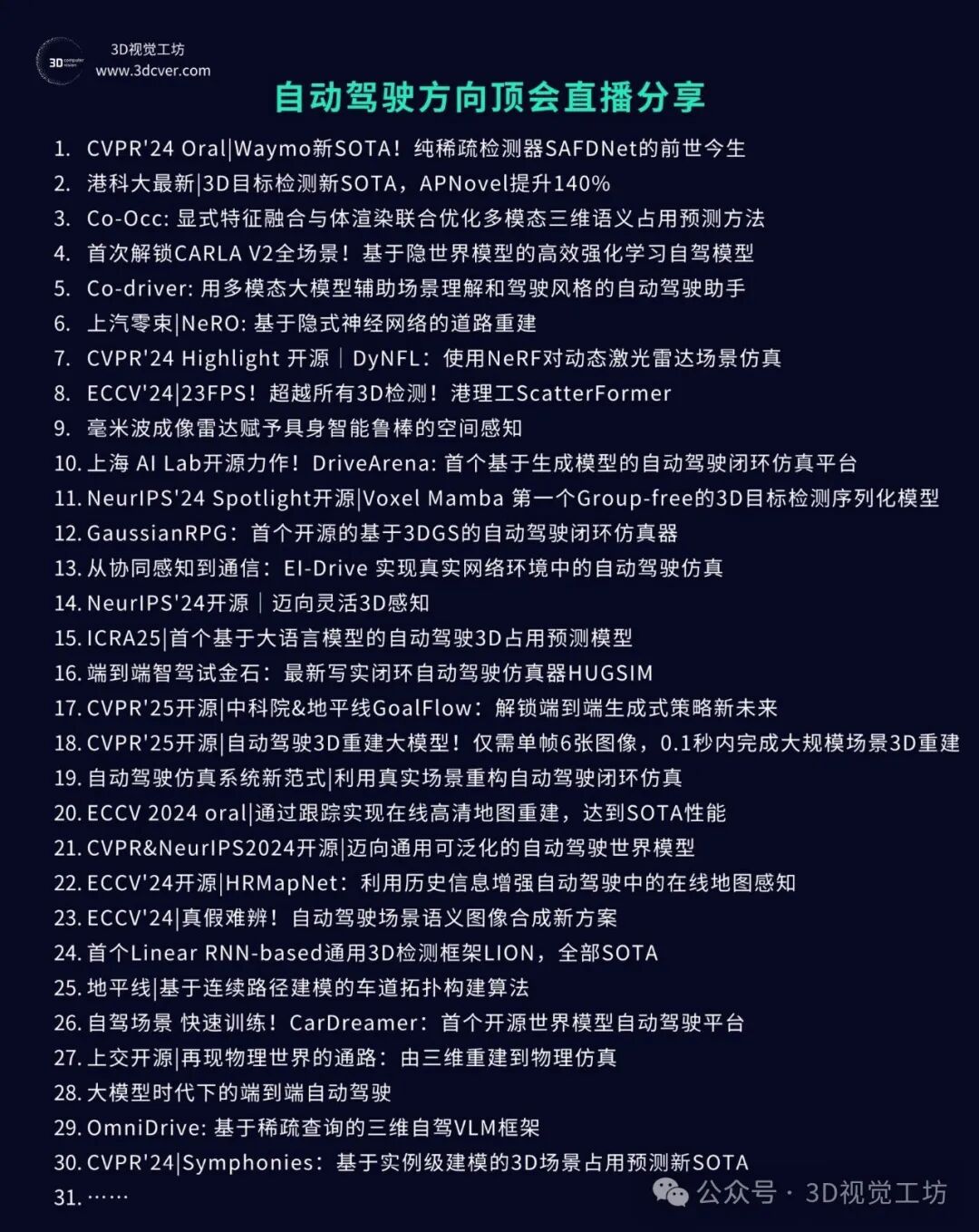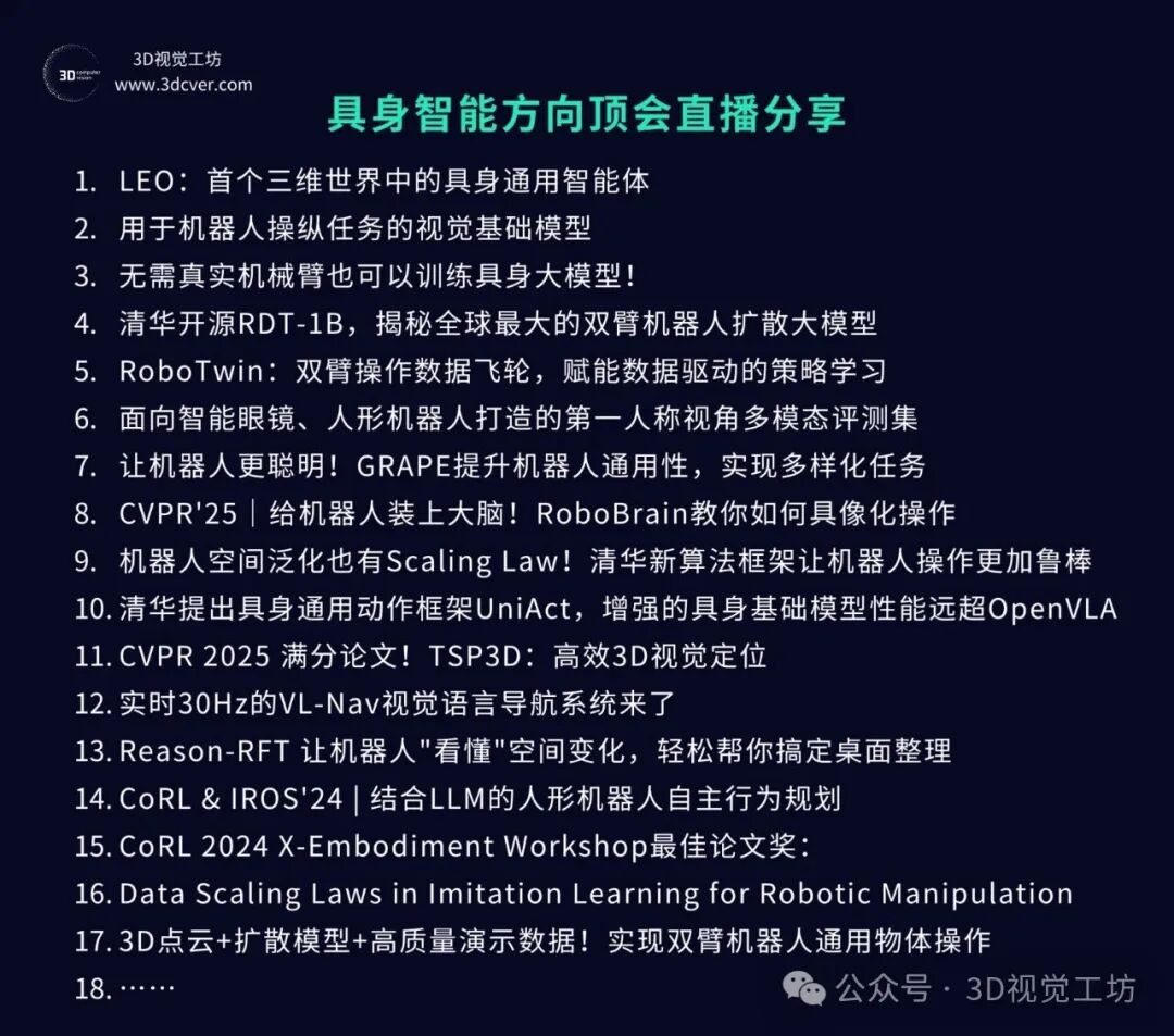 星球内已沉淀近超过100场3D视觉顶会论文直播回放,内容覆盖具身智能、自动驾驶、三维重建、数字人、扩散模型、3D生成等前沿领域。
