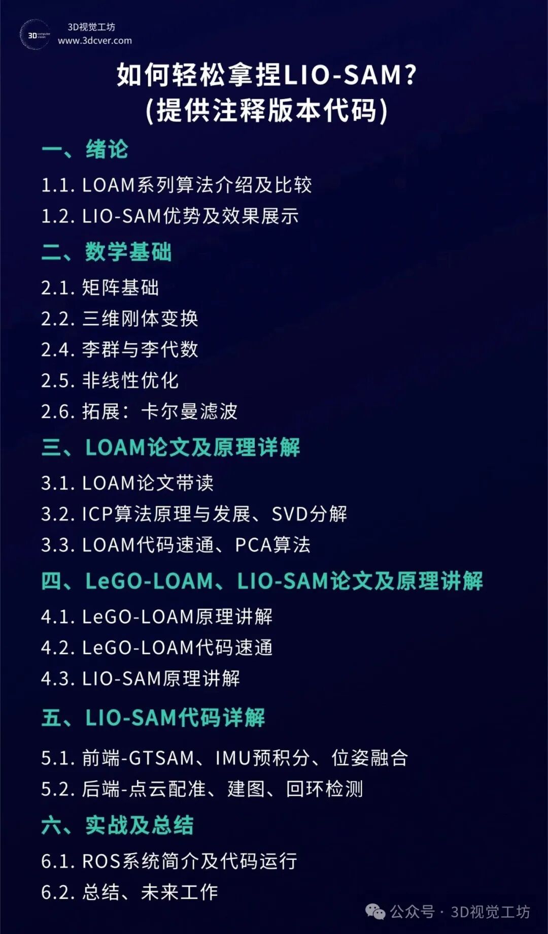 视觉-惯性SLAM的入门与实践视频教程,结合VINS-Fusion源码,系统地对视觉-惯性SLAM的基础理论知识进行梳理。整套课程由一线算法工程师教授,从基础理论到代码剖析,保姆级教学,助力学员一步步从小白成长为大牛。