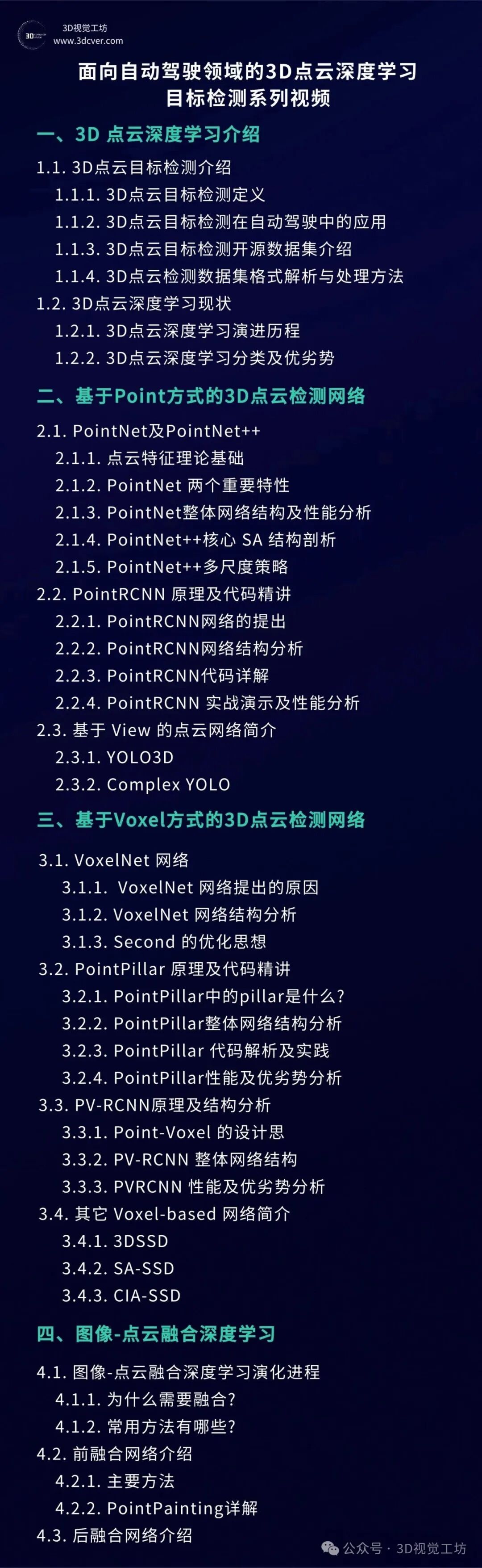 本视频教程以3D点云深度学习为主,对Point-based和Voxel-based系列的3D目标检测网络架构进行系统剖析和代码梳理,助力各位同学在点云深度学习更快的入门和更深的理解。