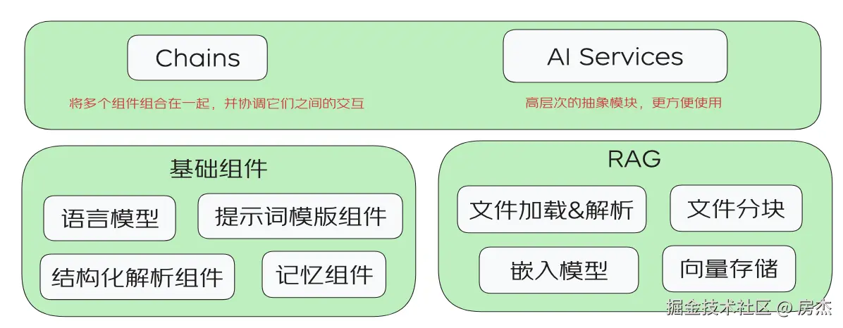 - 全面的工具箱:工具箱包括各种工具,从低级提示模板、聊天记忆管理和输出解析到高级模式,如 AI Services 和 RAG。