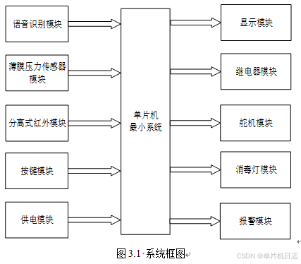 本设计以单片机为核心控制器,加上其他模块一起组成此次设计垃圾桶的整个系统,其中包括中控部分、输入部分和输出部分。中控部分采用了单片机控制器,其主要作用是获取输入部分的数据,经过内部处理,逻辑判断,最终控制输出部分。输入由五部分组成,第一部分是语音识别模块,通过该模块控制不同的垃圾桶的开关;第二部分是薄膜式压力传感器,通过该模块监测当前垃圾的重量;第三部分是分离式红外模块,通过该模块监测垃圾桶垃圾是否满;第四部分是按键模块,通过该模块可以控制垃圾桶的开关等;第五部分是供电模块,通过该模块可给整个系统进行供电。输出由五部分组成,第一部分是显示模块,通过该模块可以显示监测的数据;第二部分是继电器模块,通过两个继电器分别控制垃圾桶打包;第三部分是舵机模块,两个舵机控制垃圾桶盖的打开或者关闭;;第四部分是消毒灯模块,可以定时对垃圾桶内垃圾进行消毒;第五部分是报警模块,垃圾打包完成进行蜂鸣器提醒,具体系统框图如图3.1所示。