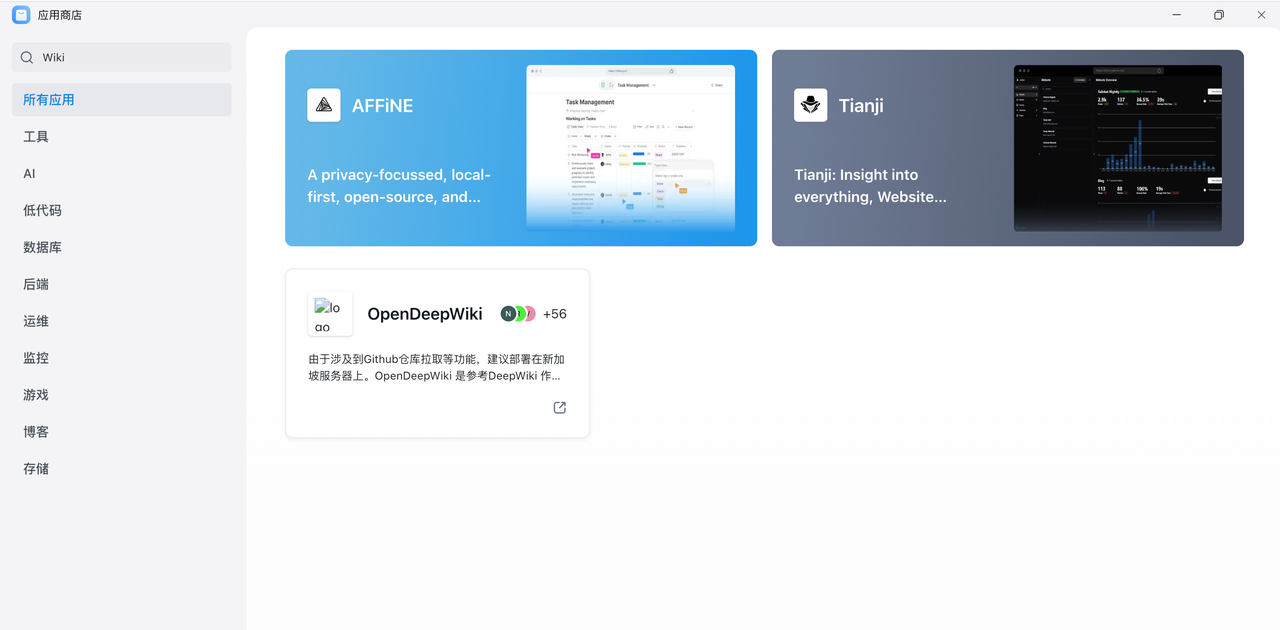 回到「应用商店」,搜索 wiki.js,点击进入它的部署页面。