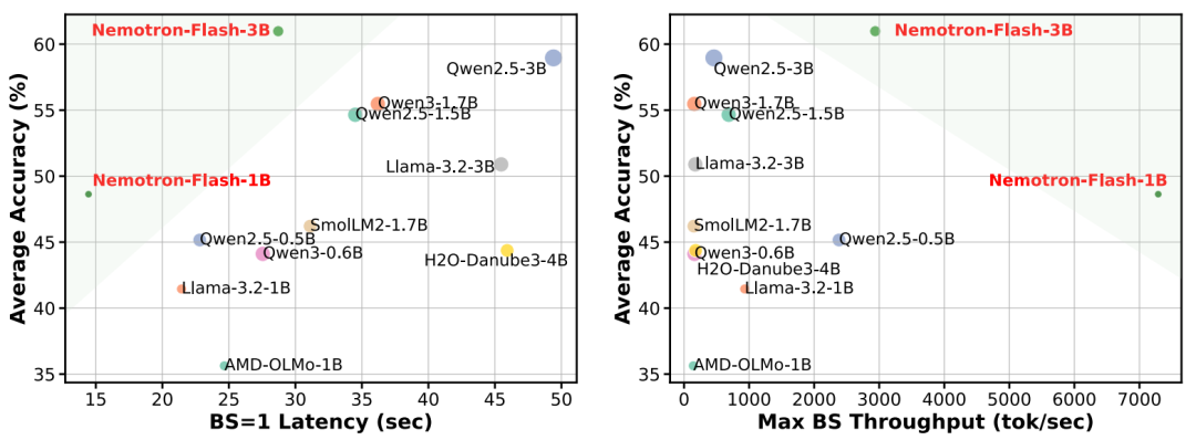 Nemotron-Flash 结合了上面所有技术,提供 1B 和 3B 两种模型大小。在 H100 上的实测结果显示: