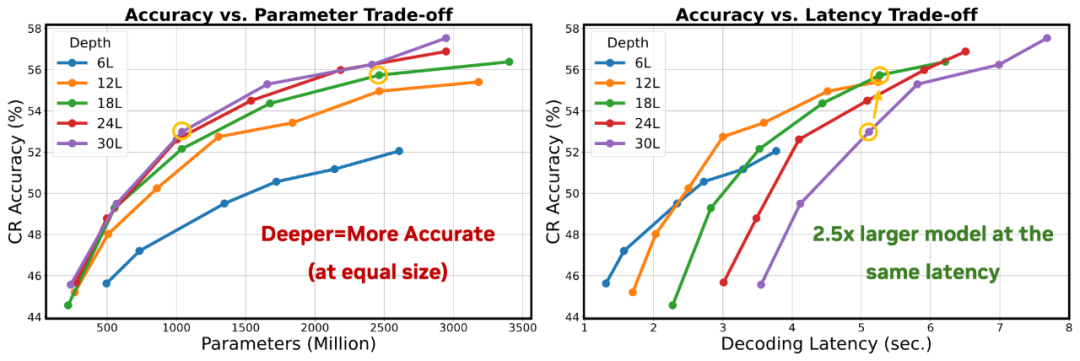 Nemotron-Flash 的大量真实设备实验揭示了小模型容易被忽略的规律:等参数下,越深越强;等延迟下,越宽越快。这两者天然冲突,意味着:深宽比不是一个随手调的超参,而是决定小模型最终能力和延迟的核心结构维度。