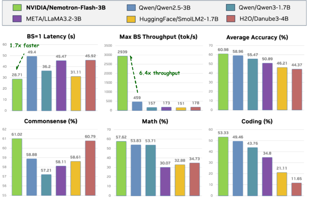 Nemotron-Flash-1B 相比 Qwen3-0.6B,准确率提升 5.5%,端侧推理延迟(batch size=1)快 1.9×,最大吞吐高出 45.6×;