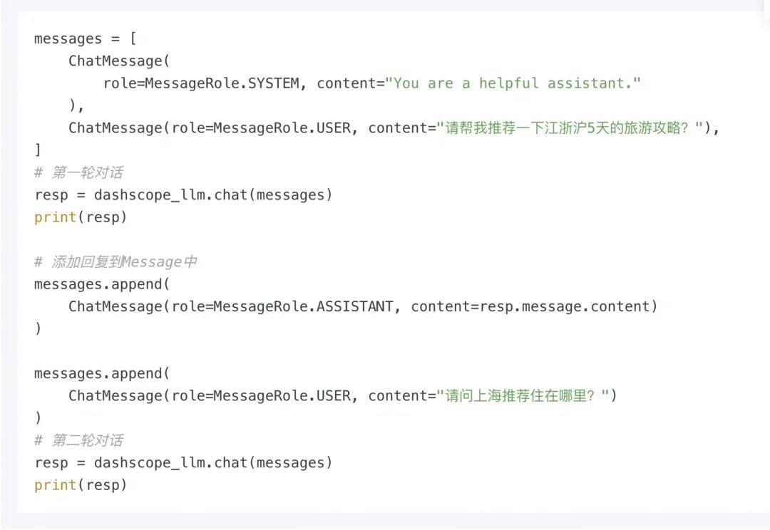 我们来看一下下面简单的多轮对话实现方式,可以看到多轮对话的理论就是将之前对话的role(usr、system)和message,append到长期维护的messages队列中,然后再把整个messages队列输入到大模型中: