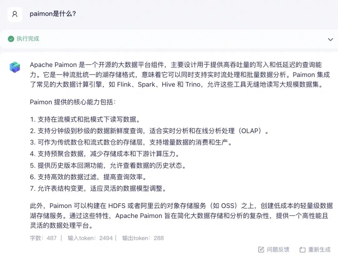 要注意,幻觉是不可避免的,有时候prompt的语料“打”不过模型本身的泛化能力,模型会自信的根据自己的能力自说自话。比如提出这样的一个问题“paimon是什么?”,由于paimon本身是一个比较新的湖格式,并且即使制定了大模型搜索大数据相关的知识,大模型有时候也没有链接到湖格式的逻辑思维,所以会出现以下的情况: