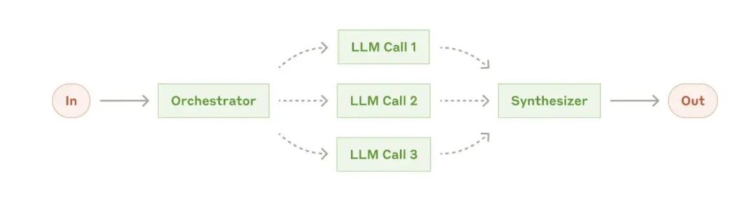 协调者-工人模式(Orchestrator-Workers):一个中心LLM负责将任务拆解并分派给多个子任务,再汇总结果。适用于复杂任务,任务步骤不可预见。例子:编码智能体在多个文件中做出复杂修改。