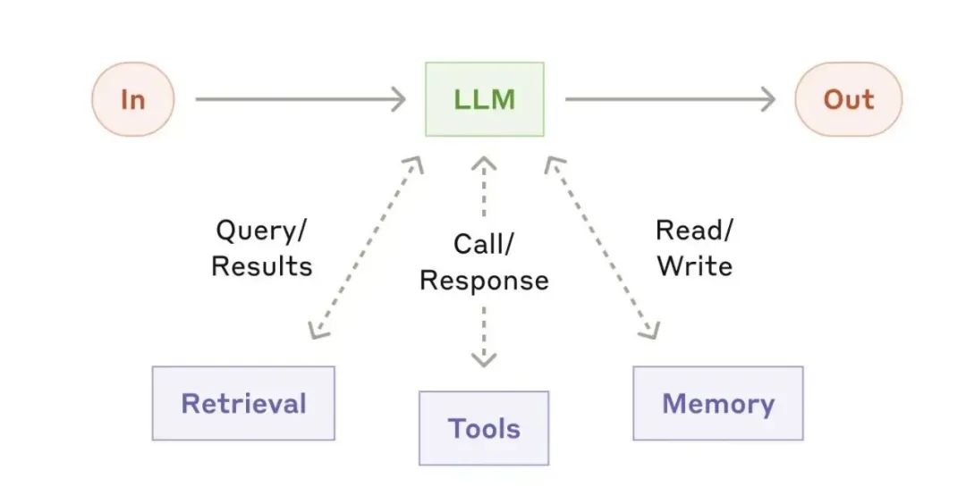 智能体系统的核心构建模块是增强型LLM。增强型LLM通过集成信息检索、工具使用(如API调用)和记忆(记录历史互动)等功能,使LLM能够执行比简单文本生成更复杂的任务。