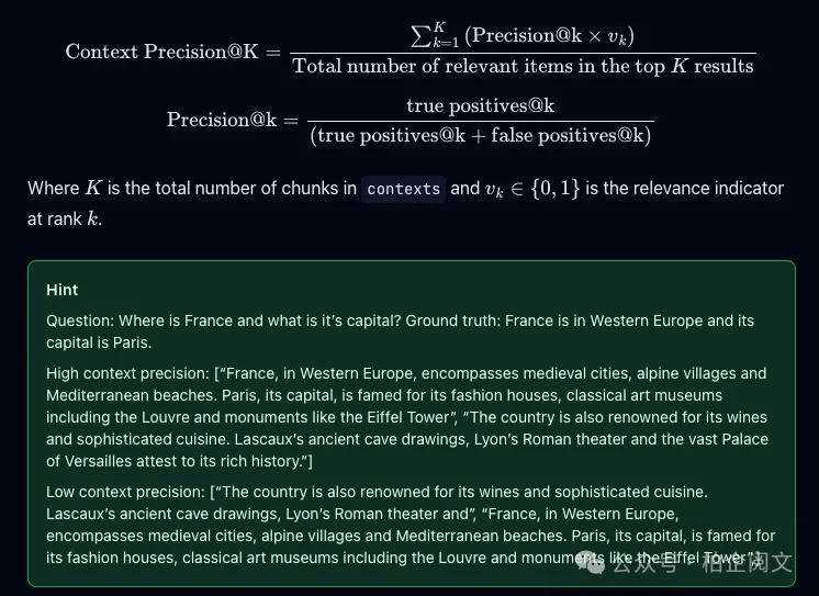 上下文精确率是一种评估RAG流程中检索器质量的RAG指标。当我们讨论上下文指标时,主要关注检索上下文的相关性。较高的上下文精确率分数意味着检索上下文中相关的节点比不相关的节点排名更高。这很重要,因为大语言模型会更重视检索上下文中排在前面的节点中的信息,这会影响最终输出的质量。