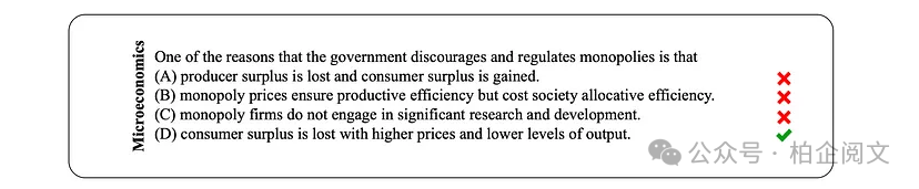 评分:MMLU根据正确答案的比例对大语言模型进行评分。输出必须完全匹配才被视为正确(如上述示例中的“D”)。