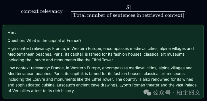 这个指标用于衡量检索到的上下文的相关性,它基于问题和上下文进行计算,取值范围在(0, 1)之间,数值越高表示相关性越好。