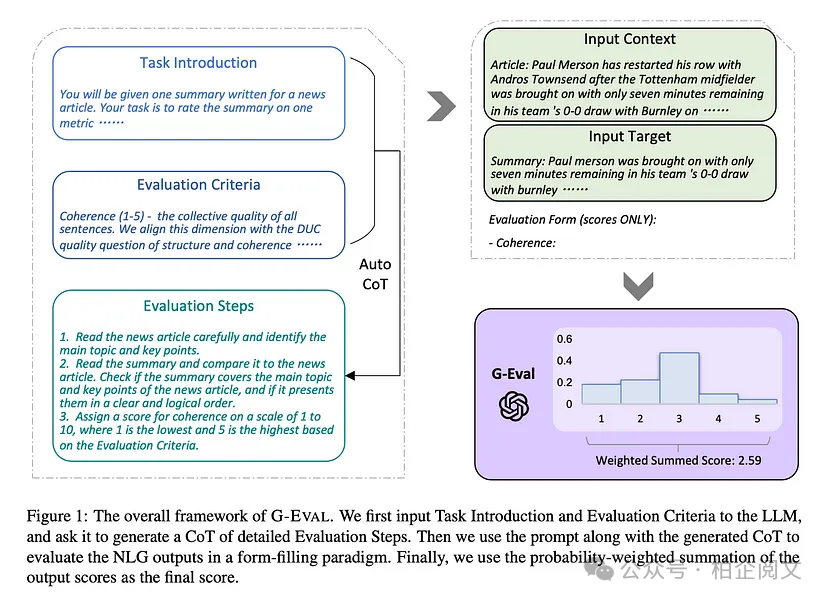 这种方法通过利用大语言模型的高级推理能力确保了准确性,同时避免了大语言模型生成分数的不可靠性,使其成为比G-Eval更好的评分方法。