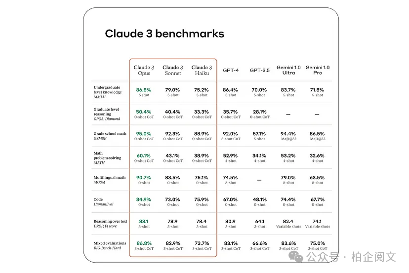 可以把它们想象成高中生的学术水平测试,只不过是针对大语言模型的。虽然它们无法评估模型能力的方方面面,但确实能提供有价值的见解。下面是Claude 3在多个基准测试中与其他最前沿模型的性能对比。