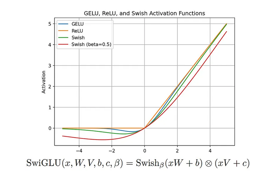 SwiGLU(Swish激活函数+门控线性单元)增强了模型突出重要特征的能力。它采用基于Swish激活函数的门控机制,有助于控制哪些信息能够通过。