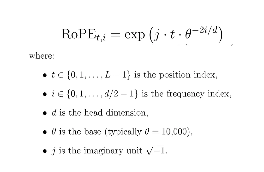 RoPE(旋转位置编码)利用带有旋转特性的正弦函数对词元(token)的位置进行编码,使得嵌入向量能够通过“旋转”来反映相对位置关系。