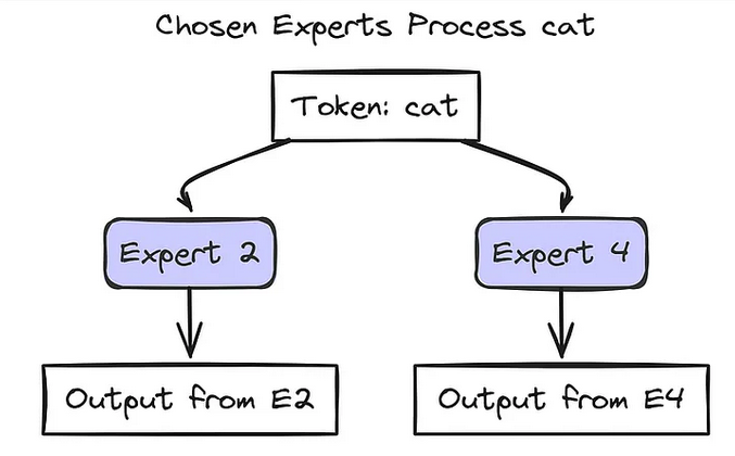 我们通过路由分配的权重合并所选专家的输出结果:最终输出 = (0.7 × Output_E2) + (0.3 × Output_E4);这个 Final_Output 就是 MoE 层针对标记 "cat" 最终传递的结果。而序列中的每个标记都会经历这样的处理流程!不同标记可能会被路由到不同的专家组合。