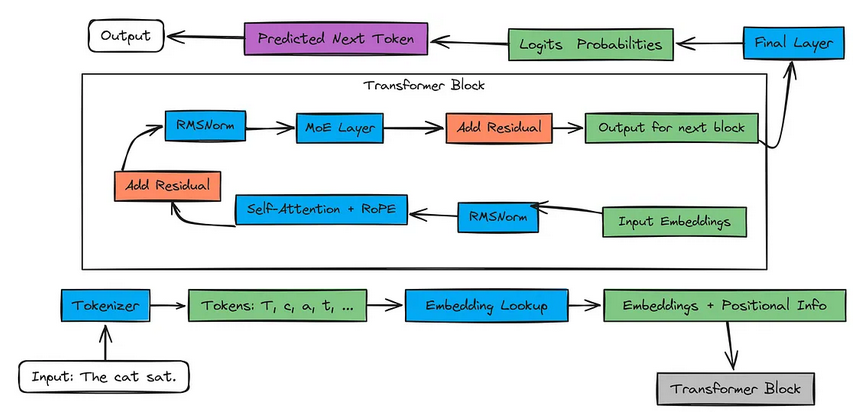 这些向量会经过多个Transformer模块。每个模块包含:(a)自注意力机制;(b)Router 分配,混合专家层;(c)归一化(RMSNorm)和残差连接有助于模型学习;