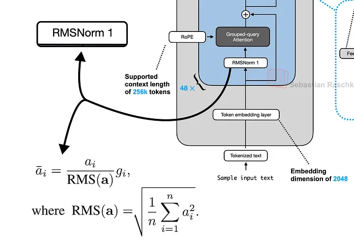 在每个Transformer子层(注意力层或前馈层)之前应用RMSNorm(均方根归一化)。它根据输入的均方根进行缩放,但不减去均值(与LayerNorm不同)。这有助于稳定训练,并在早期保持重要信号的强度,就像在深入学习教科书之前先复习关键章节一样,相关参考论文《Root Mean Square Layer Normalization》。