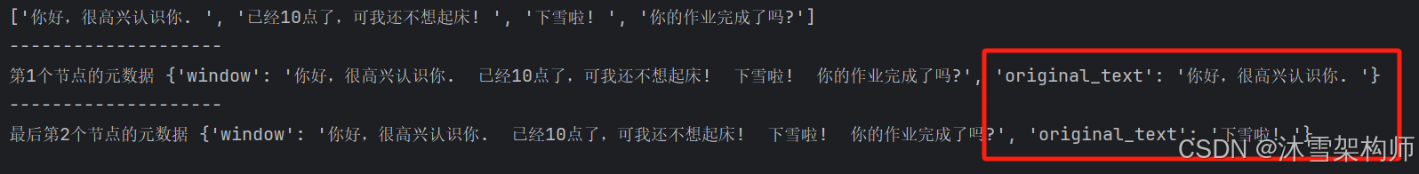 - 我们查看第一个文档的元数据,第一个文档也就是原始文档的第一个句子,因此窗口数据中只包含了当前句子和后续两条句子共3个句子。