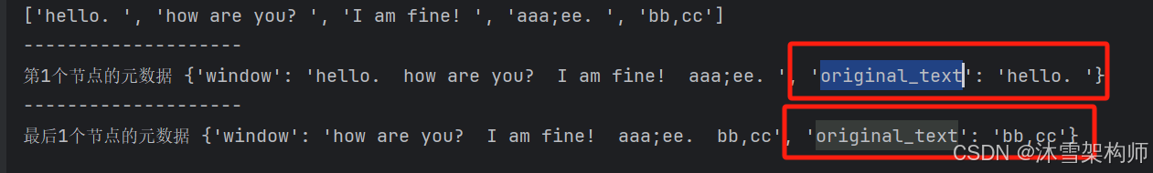 - 可看到英文字符串 "hello. how are you? I am fine! aaa;ee. bb,cc" 被拆分成了5个句子,这是因为SentenceWindowNodeParser是根据句尾的标点符号如句号(.), 问候(?),感叹号(!)来识别和切割句子的。