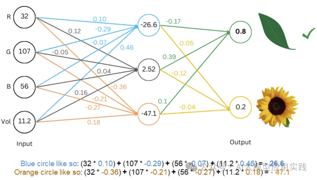 注意,模型本身并不理解叶子、花朵或 RGB 和体积的含义。它的任务仅仅是接收 4 个数字作为输入,输出 2 个数字。我们根据自己的解释,将输入视为 RGB 和体积,将输出视为叶子或花朵的概率。这种解释完全由我们决定,而模型的任务只是通过合适的权重将输入映射到最后的输出。
