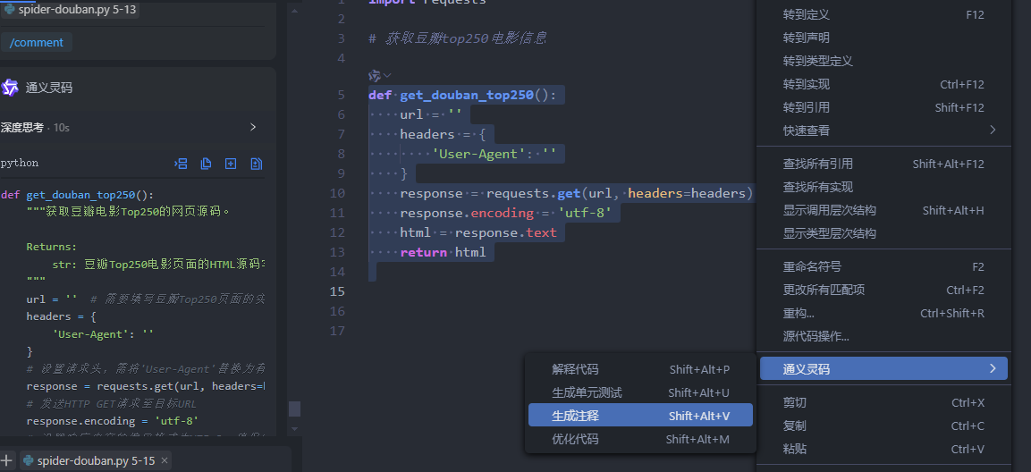 通义灵码可为选中的代码逐行添加注释,帮助你更好地理解和维护他人代码。