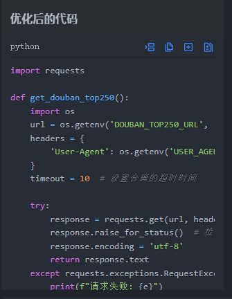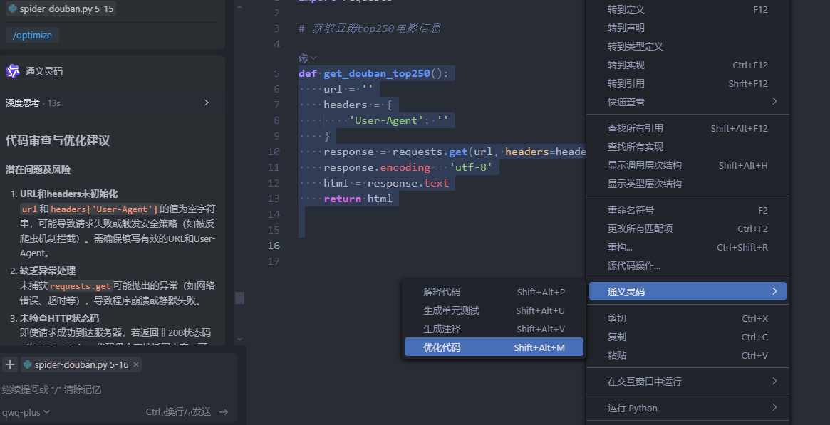 此时,通义灵码的代码审查和优化功能可派上用场,选中优化代码功能,它会生成代码的审查和优化建议,甚至直接生成优化后的代码。