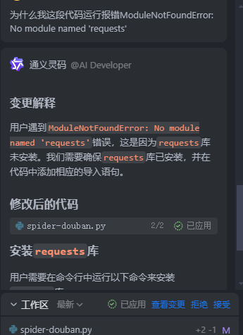 Python 的第三方库极其丰富,传统做法是通过访问 pypi 找到需要的项目,但这要求你知道项目用途,如知道 requests 库用于 http 请求发送。而实际中,我们可能不知道用什么工具以及工具的使用方法,此时通义灵码的智能问答功能就能提供帮助。