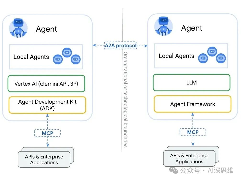 在A2A协议出现之前,AI智能体之间很难直接对话和协作,必须依赖开发者定制的接口。这就像是每个国家都有自己的语言和规矩,想要互相沟通、做生意、交换情报非常困难。A2A协议的出现,解决了这个“智能体孤岛”问题,让不同来源、不同技术的AI智能体能够相互沟通、安全地交换信息,并协同执行跨企业平台或应用的复杂任务。